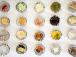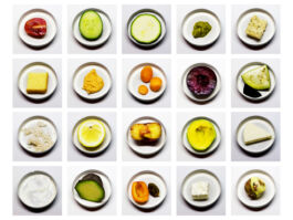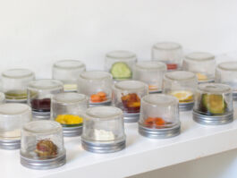 Each jar contains a different host: plum, apricot, tomato, carrot, yogurt, aubergine, avocado, cucumber, bread, yogurt, hummus, pesto, zucchini, lemon, cheese, cake, or mango.