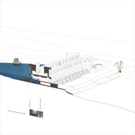 The drawing shows Zayandeh Rud river, schematic representation of the Madis, Isfahan’s peculiar soil section, Khaju Bridge as a key to the water system and its foundation which acts as an underground dam for the water reservoir. The drawing also refers to the wind tunnels that the architecture of Khaju bridge creates and its effects on temperature as well as the speed of water. The drawing has multiple scales and the soil section is scaled up due to its importance.