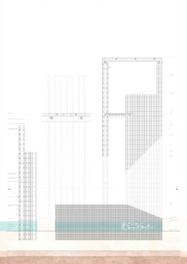 One important aspect of the design is playing with the natural forces such as water and wind. The ground level is slightly elevated (21 cm) from the regular water level and it has the same level as Bosphorus' high tide. So during the high tide most of the spaces become wet except for the concrete islands, one zone along the northern axis, and spaces on upper levels which are accessible through ladders. Even during the low tide, there is a layer of water on top of the foundation. The ecosystems that emerge are seen through the meshed flooring. The zigzag form of the building and its foundation controls the speed of water. In the indents of the zigzag form where the speed is lower, Bosphorus can be transformed to a swimming/fishing pool. The hanging columns that move with the forces of water and wind make random musical compositions and celebrate the indeterminacy caused by this natural force.