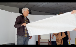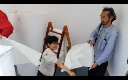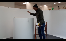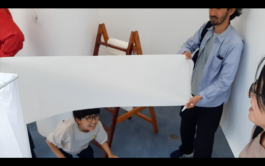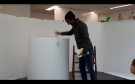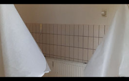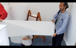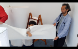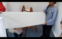 The project was constructed collectively by the artists and the visitors resulting in five different pieces. (1) The first artwork is a paper hung at the door frame, and in order to enter the exhibition room one has to tear this paper through their body. The paper will be replaced from time to time by the artists. (2) The second experience is climbing up a ladder and throwing ceramic pieces in a paper-tube which is hung from the ceiling. The broken ceramics will form a pile under the paper-tube. The broken ceramic pile will be revealed after the show (3) In the third artwork the artists and the audience collectively punch papers. Two people will hold the two sides of the paper and one punches it. The results of these punches are then stacked on a glass table designed specifically for this piece. (4) Other punched papers will end up in another piece: a frame which is positioned in front of the window. The light coming from the window illuminates the multiple layers and fractal lines of punched papers from behind. (5) A U-shaped hung paper-curtain creates the boundaries of the space and intensifies the experience and creates the play-ground.