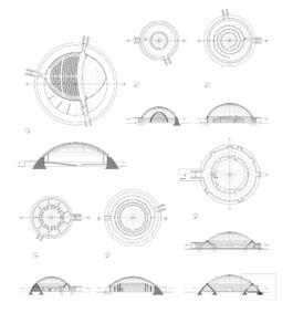 Five of the big domes are the main exhibition spaces and one of them is an amphitheatre. The roofs are made from prefabricated GRP panels that are translucent and let natural light in. They are also very light and easily and they can be quickly and easily assembled and disassembled. Furthermore, through methods such thickening the walls or making circular vaults the construction of bigger domes is possible.